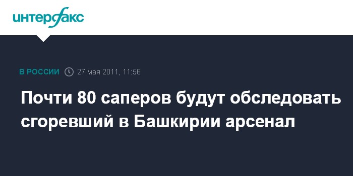 Москва. 27 мая. INTERFAX.RU - Саперы приступили к разведке местности на территории 99-го арсенала в Башкирии, где продолжают взрываться боеприпасы, сообщил "Интерфаксу-АВН" в пятницу официальный представитель Минобороны РФ полковник Игорь Конашенков.