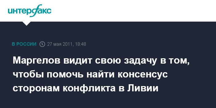 "Передо мной стоит задача встретиться с лидерами повстанцев и продолжить то, что Россия делает не первый месяц - способствовать тому, чтобы между ответственными представителями ливийской политической элиты, которые заинтересованы в том, чтобы Ливия сохранилась как единое независимое государство, играющее важную роль, как в арабском мире, так и в Африке, для того, чтобы помочь им найти пути к достижению национального консенсуса", - сообщил "Интерфаксу" по телефону Маргелов.