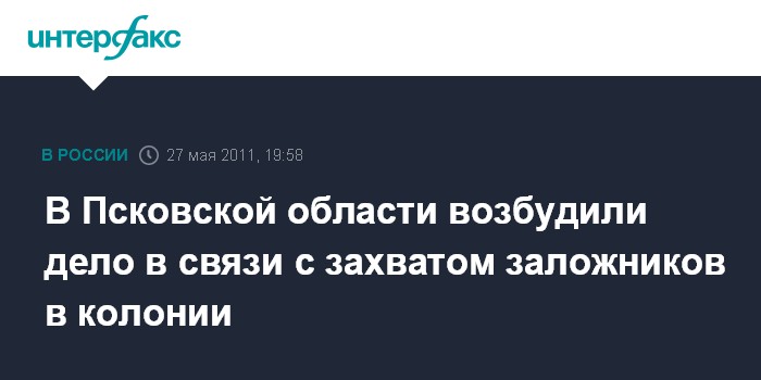 Псков. 27 мая. INTERFAX.RU - По факту захвата заложников в исправительной колонии строгого режима в поселке Середка Псковской области возбуждено уголовное дело, сообщили "Интерфаксу" в региональном УВД.
