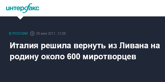 Рим. 28 мая. INTERFAX.RU - Около 600 итальянских миротворцев решено вернуть на родину из Ливана, заявил в субботу в интервью газете "Репубблика" министр обороны Италии Иньяцио Ла Русса. "Мы не собираемся бросать Ливан в беде, но 1780 наших миротворцев в Ливане - это слишком много", - пояснил он. Свое решение И.Ла Русса озвучил после произошедшего в пятницу в Ливане теракта, в результате которого ранения получили шестеро миротворцев из Италии.