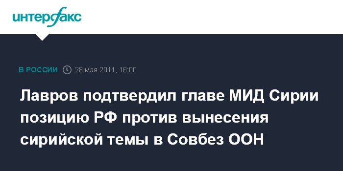 Москва. 28 мая. INTERFAX.RU - Министр иностранных дел РФ Сергей Лавров обсудил в субботу в телефонном разговоре с главой МИД Сирии Валидом Муалемом ситуацию в этой стране. "С.Лавров отметил важность достижения позитивных сдвигов в ближайшее время. Он подтвердил принципиальную позицию России против вынесения сирийской темы в Совет Безопасности ООН", - говорится в сообщении МИД РФ, размещенном на сайте ведомства.