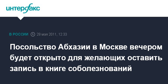 Москва. 29 мая. INTERFAX.RU - В посольстве Абхазии в Москве во второй половине дня будет открыта "книга соболезнований" в связи с кончиной президента республики Сергея Багапша. Как передает корреспондент "Интерфакса", флаг на посольстве Абхазии приспущен и обрамлен траурной черной лентой. "Сегодня во второй половине дня посольство будет открыто для людей, которые захотят оставить свои записи в книге соболезнований", - сообщила "Интерфаксу" в воскресенье пресс-секретарь посольства Татьяна Гулиа.