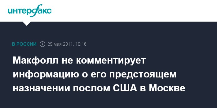 В воскресном номере газеты "Нью-Йорк таймс" опубликовано сообщение о том, что М.Макфолл - известный как автор "перезагрузки" отношений США и России - может быть назначен на должность американского посла в Москве. Об этом "Нью-Йорк таймс" сообщили неназванные источники в администрации президента США, и об этом шла речь в ходе встречи президентов России и США в Довилле (Франция). В большинстве случаев информация "Нью-Йорк таймс" - самой влиятельной и информированной газеты в США - является точной.