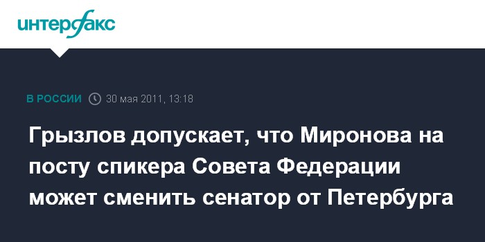 Москва. 30 мая. INTERFAX.RU - Председатель Госдумы Борис Грызлов не отрицает, что новым спикером Совета Федерации вместо Сергея Миронова может стать представитель Санкт-Петербурга.