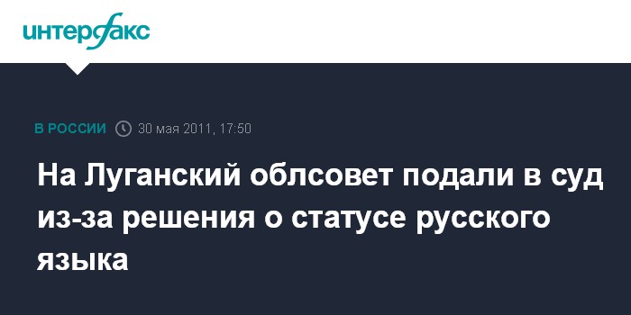 Киев. 30 мая. INTERFAX.RU - Председатель Луганской областной организации Украинской народной партии (УНП) Валентин Ткалич подал иск к областному совету с требованием признать недействительным решение облсовета от 27 мая "О реализации конституционных гарантий на свободное использование русского языка, других языков национальных меньшинств в Луганской области".