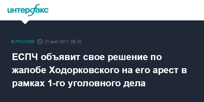 Страсбург. 31 мая. INTERFAX.RU - Европейский суд по правам человека (ЕСПЧ) озвучит свое решение по жалобе экс-главы НК "ЮКОС" Михаила Ходорковского на его арест в рамках первого уголовного дела.