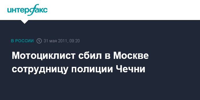 Москва. 31 мая. INTERFAX.RU - В Москве на проспекте Вернадского мотоциклист сбил сотрудницу чеченской полиции, женщину госпитализировали, сообщил во вторник "Интерфаксу" источник в правоохранительных органах города.