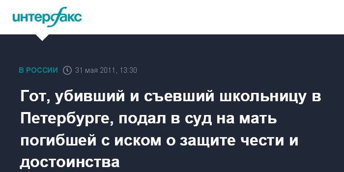 Гот, убивший и съевший школьницу в Петербурге, подал в суд на мать погибшей с иском о защите чести и достоинства