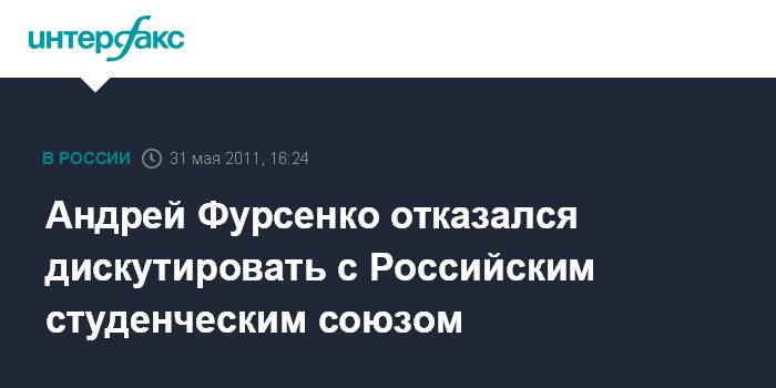 Москва. 31 мая. ИНТЕРФАКС - Министр образования и науки РФ Андрей Фурсенко отказался принять участие в публичных дебатах с Российским студенческим союзом (РСС).
