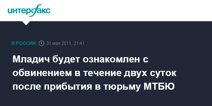 Белград. 31 мая. INTERFAX.RU - Бывший военный лидер боснийских сербов Ратко Младич должен будет в первый раз появиться перед судебным следователем в Международном трибунале по бывшей Югославии (МТБЮ) в течение 48 часов после прибытия в Схевенинген, где расположена тюрьма МТБЮ, сообщает белградская независимая радиостанция Б-92.