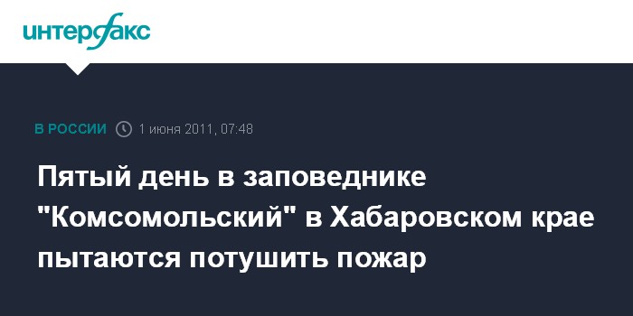Хабаровск. 1 июня. ИНТЕРФАКС-ДАЛЬНИЙ ВОСТОК - За сутки площадь пожара в заповеднике "Комсомольский" в Хабаровском крае уменьшилась незначительно - до 474 га, сообщили агентству "Интерфакс-Дальний Восток" в Департаменте лесного хозяйства по ДФО в среду.