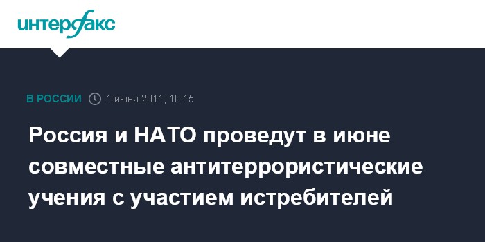 Москва. 1 июня. INTERFAX.RU - Россия и НАТО впервые проведут совместные учения по противодействию воздушному терроризму, сообщает Национальный антитеррористический комитет (НАК).