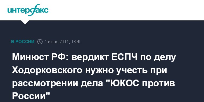 Москва. 1 июня. INTERFAX.RU - Решение Европейского суда по правам человека (ЕСПЧ) по жалобе "Ходорковский против России" должно быть учтено при рассмотрении дела "ЮКОС против России", считают В Минюсте РФ.