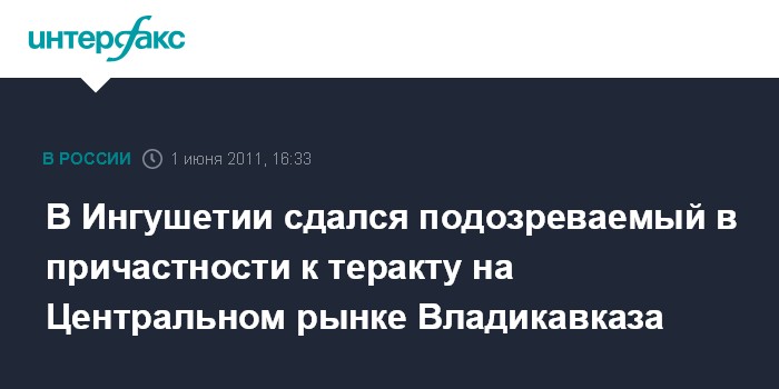 Москва. 1 июня. INTERFAX.RU - В органы власти Ингушетии явился предполагаемый участник бандгруппы, совершившей 9 сентября 2010 года теракт на Центральном рынке Владикавказа, сообщает пресс-служба УФСБ по республике.