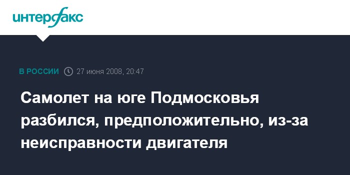 Москва. 27 июня. ИНТЕРФАКС - Техническая неисправность двигателя рассматривается в качестве одной из основных версий в ходе расследования авиакатастрофы в Подмосковье, в результате которой погибли пять человек.