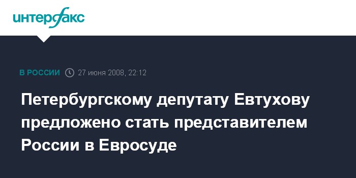 Санкт-Петербург. 27 июня. ИНТЕРФАКС СЕВЕРО-ЗАПАД - Депутат петербургского парламента Виктор Евтухов получил от Минюста РФ предложение стать представителем России в Европейском суде по правам человека, находящемся в Страсбурге.