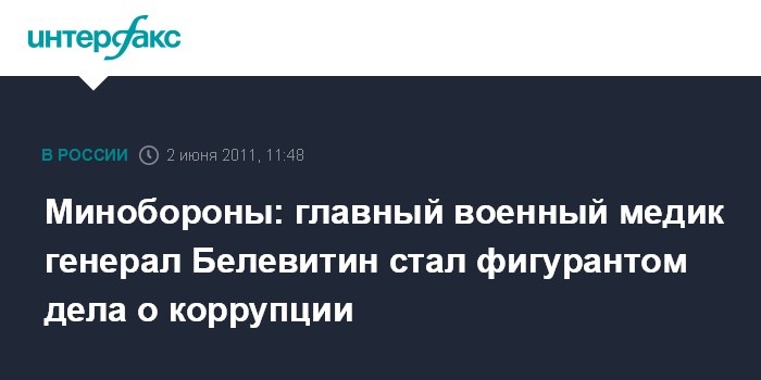 Москва. 2 июня. INTERFAX.RU - Главный военный медик генерал-майор Александр Белевитин и начальник управления Главного военного медицинского управления Минобороны РФ полковник Алексей Никитин задержаны по подозрению в коррупции, сообщили "Интерфаксу-АВН" в управлении пресс-службы и информации военного ведомства.