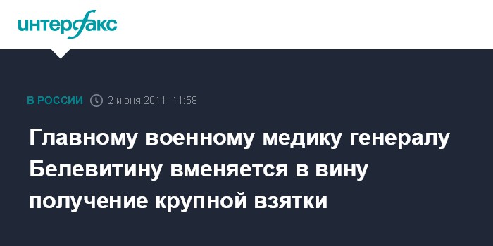 Главному военному медику генералу Белевитину вменяется в вину получение крупной взятки