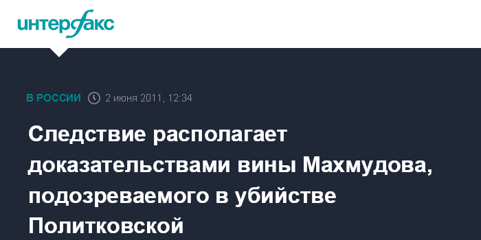 Москва. 2 июня. INTERFAX.RU - Следственные органы получили достаточно доказательств вины Рустама Махмудова, который ранее был задержан в Чечне по подозрению в убийстве журналистки "Новой газеты" Анны Политковской.