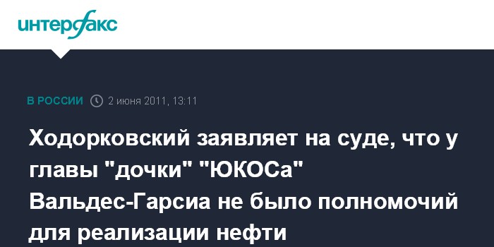 Москва. 2 июня. INTERFAX.RU - Бывший глава НК "ЮКОС" Михаил Ходорковский заявил в Басманном суде Москвы в качестве свидетеля по делу экс-главы подконтрольной "ЮКОСу" компании "Фаргойл" Антонио Вальдес-Гарсиа, что у того отсутствовали достаточные полномочия для совершения инкриминируемых деяний.