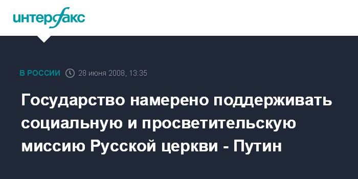 "Государство и впредь намерено поддерживать инициативы церкви, направленные на укрепление гражданского и межрелигиозного согласия, ее социальную, культурно-просветительскую, благотворительную миссию", - подчеркнул В.Путин.