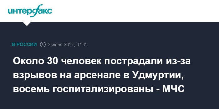 Москва. 3 июня. INTERFAX.RU - МЧС России сообщает о росте числа пострадавших в результате взрывов на военном арсенале в Удмуртии.