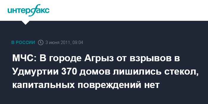 Казань. 3 июня. INTERFAX.RU - В райцентре Агрыз (Татарстан), который находится в 9-10 км от горящего арсенала в Удмуртии, взрывной волной выбиты стекла в 370 из почти 9 тысяч жилых домов, сообщили агентству "Интерфакс-Поволжье" в пресс-службе ГУ МЧС РФ по Татарстану в пятницу.