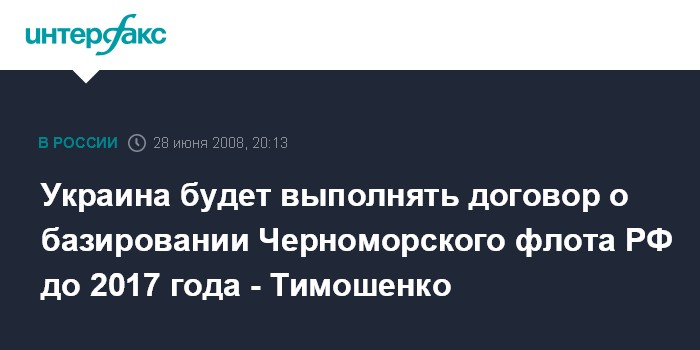 Москва. 28 июня. INTERFAX.RU - Украина не намерена пересматривать условия базирования Черноморского Флота Российской Федерации на своей территории, сказала премьер-министр Украины Юлия Тимошенко