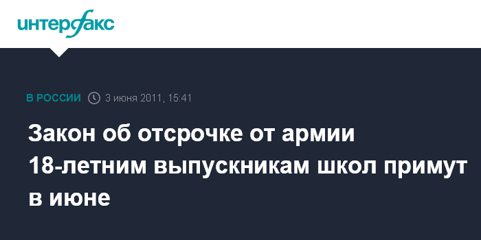 "Выполняя решение президента, мы сегодня провели совместное заседание с Минобороны по выработке единых подходов, связанных с предоставлением права на отсрочку выпускникам средних школ, которым исполнилось 18 лет. Уже в июне такой законопроект, я надеюсь, будет принят в трех чтениях, - сказал Заварзин в пятницу журналистам в Москве.
