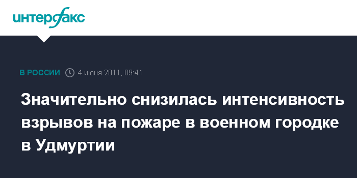 Нижний Новгород. 4 июня. INTERFAX.RU - Интенсивность взрывов в военной части в деревне Пугачево в Удмуртии снизилась от 40 до 4-5 в минуту, сообщается на сайте ГУ МЧС по республике. По сообщению МЧС, за ночь интенсивность взрывов значительно уменьшилась и составляет примерно 4-5 взрывов в минуту. В сообщении также отмечается, что участок Ижевск-Можга федеральной трассы М7 остается закрытым для проезда гражданского автотранспорта.