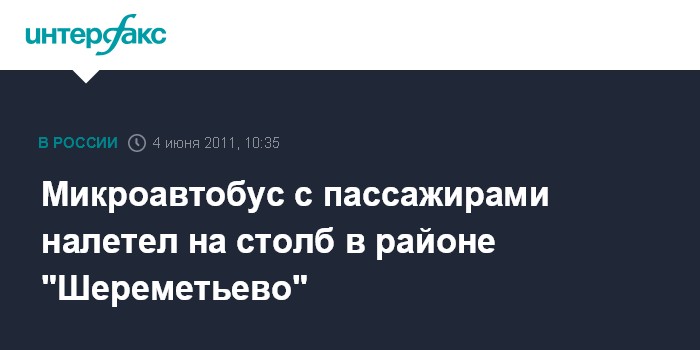 Москва. 4 июня. INTERFAX.RU - В медпункт аэропорта "Шереметьево-1" обратились десять пассажиров микроавтобуса, налетевшего на столб ЛЭП, сообщил "Интерфаксу" в субботу источник в правоохранительных органах. По его информации, сообщение о дорожно-транспортном происшествии поступило в полицию из медицинского пункта аэропорта "Шереметьево-1".