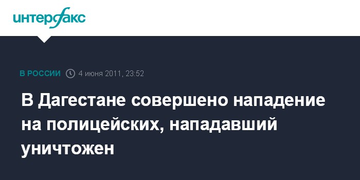 Махачкала. 4 июня. ИНТЕРФАКС-ЮГ – Нападение на сотрудников полиции совершено в субботу в дагестанском городе Кизляр, нападавший уничтожен в перестрелке, сообщили агентству "Интерфакс – Юг" в пресс-службе МВД Дагестана.