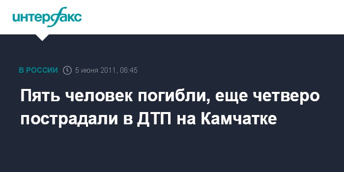 Петропавловск-Камчатский. 5 июня. ИНТЕРФАКС-ДАЛЬНИЙ ВОСТОК - В результате столкновения внедорожника и легкового автомобиля в Елизовском районе Камчатки погибли пять человек, еще четверо госпитализированы.