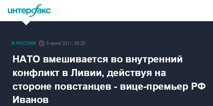 "Как заявил президент России Дмитрий Медведев, поддержав резолюцию Совета Безопасности ООН, мы исходили из того, что ее принятие направлено на укрепление мира, недопущение эскалации конфликта и гибели гражданского населения, - сказал С.Иванов.- Однако действия НАТО, которые прикрываются произвольным толкованием резолюций СБ ООН, нельзя охарактеризовать иначе, чем вмешательство в гражданскую войну на стороне одной из противоборствующих группировок".