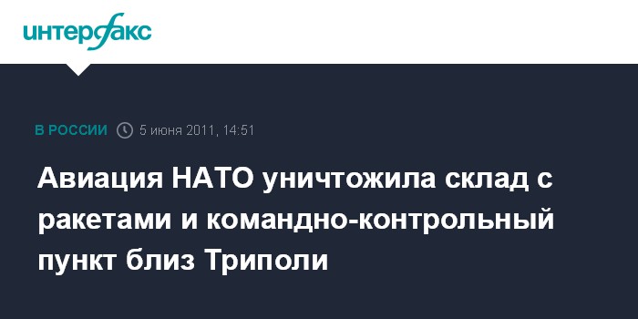 Брюссель. 5 июня. INTERFAX.RU - В минувшие сутки в результате воздушных атак близ Триполи был уничтожен склад ракет и командно-контрольный пункт, сообщила в воскресенье штаб-квартира Североатлантического альянса в Брюсселе. Ряд объектов военного назначения режима Муамара Каддафи был атакован натовской авиацией в районе Бреги, говорится в сообщении. В субботу, 4 июня, ВВС натовской коалиции совершили 130 вылетов, из которых 54 - боевых, говорится в ежедневной сводке альянса.