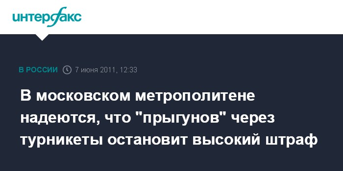 Москва. 7 июня. INTERFAX.RU - В Московском метрополитене ожидают решения столичных властей о десятикратном повышении штрафов для безбилетников, перепрыгивающих турникеты.