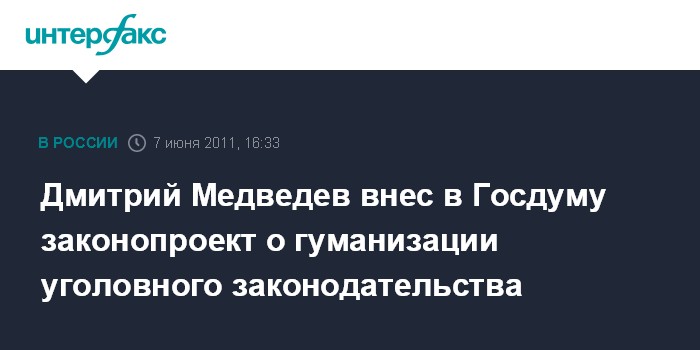 Москва. 7 июня. INTERFAX.RU - Президент России Дмитрий Медведев внес в Госдуму проект федерального закона "О внесении изменений в Уголовный кодекс РФ и отдельные законодательные акты РФ", сообщает во вторник пресс-служба Кремля.