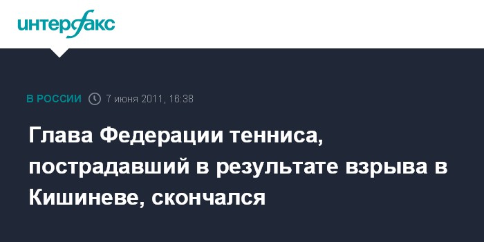 Кишинев. 7 июня. INTERFAX.RU - Президент Федерации тенниса Игорь Цуркан, пострадавший от взрыва в центре Кишинева, скончался в больнице, заявила журналистам на месте происшествия в центре Кишинева вице-президент Федерации тенниса Марина Таубер.