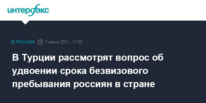 Москва. 7 июня. INTERFAX.RU - Министерство культуры и туризма Турции совместно с министерством иностранных дел страны в ближайшее время рассмотрят вопрос об увеличении срока безвизового пребывания российских туристов в стране не менее, чем до 60 дней, сообщает Федеральное агентство по туризму РФ во вторник.