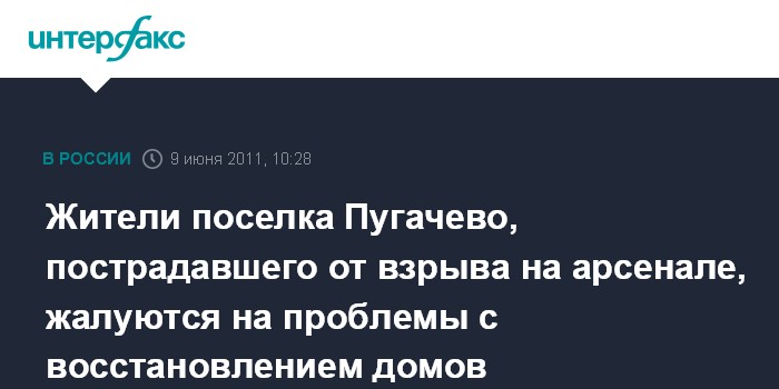 Москва. 10 июня. INTERAFX.RU – Жители поселка Пугачево в Удмуртии, пострадавшего в результате взрыва на арсенале, утверждают, что до настоящего момента работы по восстановлению домов так и не начались.