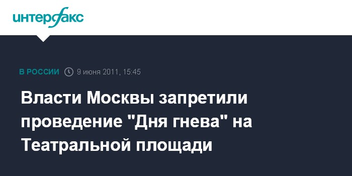 Москва. 9 июня. INTERFAX.RU - Власти Москвы официально запретили проводить 12 июня "День гнева" на Театральной площади, однако организаторы не намерены отказываться от запланированной акции.