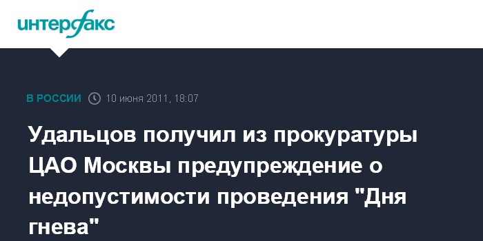 "Я получил по почте из прокуратуры Центрального административного округа Москвы предупреждение о недопустимости проведения акции "День гнева" 12 июня в 14.00 на Театральной площади", - сообщил "Интерфаксу" координатор оппозиционного движения "Левый фронт" Сергей Удальцов.