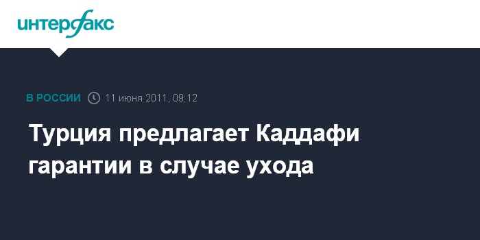 Лондон. 11 июня. INTERFAX.RU - Премьер-министр Турции Реджеп Тайип Эрдоган рассказал о том, что предложил Муаммару Каддафи гарантии в обмен на согласие покинуть Ливию. В интервью, показанном по турецкому каналу NTV, глава правительства сообщил, что все еще ждет ответа ливийского лидера на свое предложение.