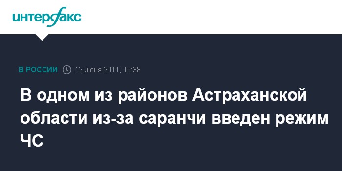 Ростов-на-Дону. 12 июня. INTERFAX.RU - Режим чрезвычайной ситуации объявлен в Камызякском районе Астраханской области в связи с угрозой распространения саранчи, сообщили агентству "Интерфакс-Юг" в пресс-службе Южного регионального центра МЧС России. "В связи с осложнившейся фитосанитарной обстановкой, связанной с угрозой нашествия саранчи, в Камызякском районе Астраханской области с 15:00 воскресенья введен режим чрезвычайной ситуации", - сказал представитель пресс-службы.