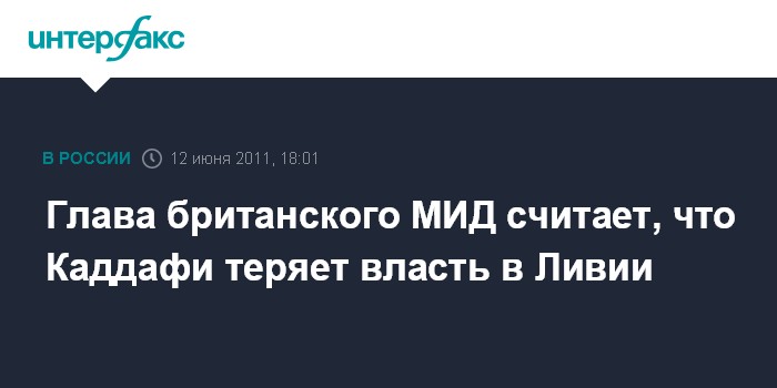 Лондон. 12 июня. INTERFAX.RU - Режим ливийского лидера Муамара Каддафи с каждым днем ослабевает, заявил глава МИД Великобритании Уильям Хейг. "Время на нашей стороне, а не на его (М.Каддафи - ИФ). Власть М.Каддафи ослабевает с каждым днем. Он проигрывает важные сражения. Мы должны проявить терпение и упорство, чтобы прийти к успеху", - сказал министр.