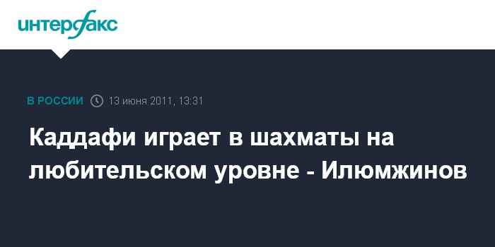 Москва. 13 июня. INTERFAX.RU - Президент ФИДЕ Кирсан Илюмжинов посетил с рабочей поездкой Тунис и сообщил, что накануне его шахматный матч с ливийским лидером Муамаром Каддафи завершился вничью. "Вчерашний матч с Каддафи завершится вничью. Я сам предложил ничью, ведь неудобно выигрывать в гостях", - сказал К.Илюмжинов "Интерфаксу" по телефону в понедельник. Отвечая на вопрос агентства, как М.Каддафи играет в шахматы, президент ФИДЕ сказал: "На уровне любителя".