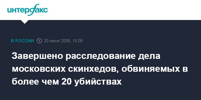 Москва. 30 июня. INTERFAX.RU - Уголовное дело в отношении группы московских скинхедов, на счету которых 20 убийств и 12 покушений на убийство по национальным мотивам, завершено и направлено для утверждения обвинительного заключения.