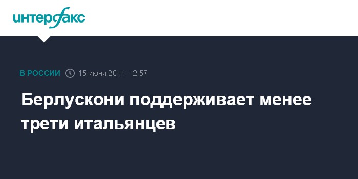 Рим. 15 июня. INTERFAX.RU - Председатель Совета министров Италии Сильвио Берлускони в настоящее время пользуется поддержкой 29% избирателей, что является рекордно низким для него показателем, говорится в опросе, проведенном для газеты "Репубблика".
