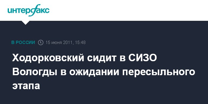 Вологда. 15 июня. INTERFAX.RU - Бывший глава "ЮКОСа" Михаил Ходорковский, этапированный из СИЗО "Матросская тишина" в Москве, в настоящее время находится в Вологодской области, сообщил "Интерфаксу" источник в региональном управлении ФСИН.