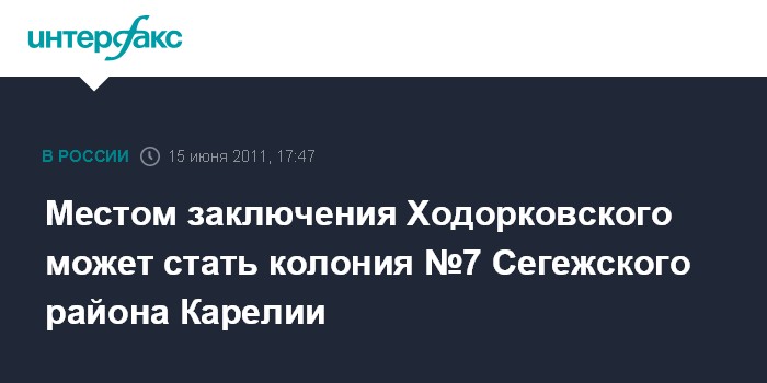 Вологда/Петрозаводск. 15 июня. INTERFAX.RU - Бывший глава "ЮКОСа" Михаил Ходорковский, скорее всего будет отбывать наказание в исправительной колонии N7 Сегежского района Карелии.